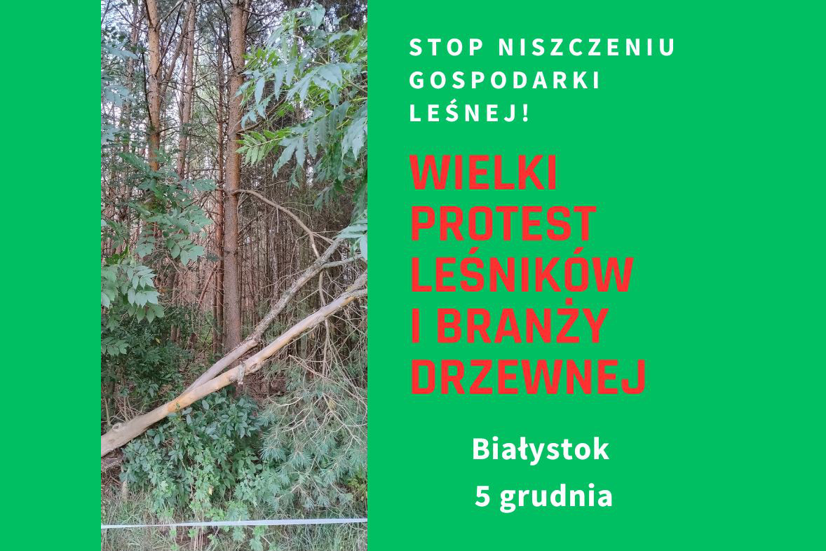 Na 5. grudnia w Białymstoku zaplanowano ogólnopolski protest środowisk związanych z gospodarką leśną. To jedna z największych mobilizacji branży od lat. Decyzję o organizacji protestu podjął Sztab Protestacyjny Leśnych Związków Zawodowych, wskazując, że to właśnie Podlasie jest regionem najbardziej dotkniętym decyzjami i ograniczeniami nakładanymi przez Ministerstwo Klimatu i Środowiska. Do wydarzenia przyłącza się również Protest Branży Drzewnej, zapraszając do wspólnego marszu wszystkich, którzy nie zgadzają się na obecny kierunek zarządzania polską przyrodą.