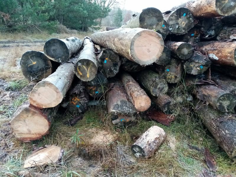 Sprzedam drewno sosnowe pochodzące z wycinki w marcu 2025, takie jak na zdjęciu.Długość kłód wynosi 5–6 metrów. Calość to ok 100 m3