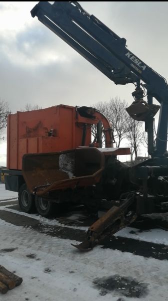 Rębak bębnowy z zasobnikiem wysokiego wywrotu o pojemności 16mp i z HDS Kesla Foresteri 600. Na podwoziu dwuosiowym z zaczepem kulowym K80 ze skrętnym dyszlem do ciągnika około 300KM. Rok produkcji 2005. Sprowadzony. W Kraju nie był używany.