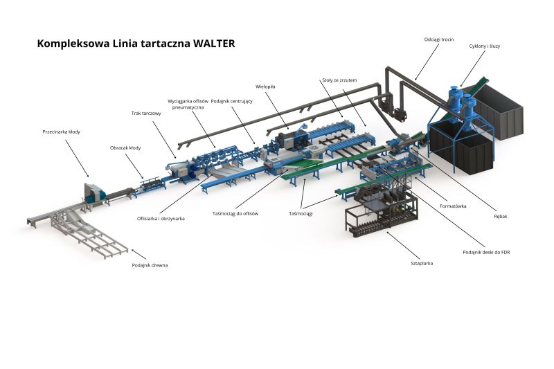 Przedstawiamy Państwu Kompleksową Linię tartaczną WALTER.Jest ona przeznaczona do rozkroju drewna okrągłego o średnicy od 120 do 450 mm, do produkcji deski paletowej. Produkowane przez nas maszyny spełniają wszystkie wymogi bezpieczeństwa dotyczące konstrukcji sprzętu do obróbki drewna. Ponadto możliwe są różne konfiguracje linii, jesteśmy w stanie zaprojektować rozstawienie maszyn i wszystkich podajników pod indywidualne potrzeby klienta i istniejące hale produkcyjne. Istnieje możliwość zainstalowania systemu obliczania drewna przechodzącego a także całego systemu odciągu trocin wraz z taśmociągami, odciągami, separatorami i cyklonami, które są również w naszej szerokiej ofercie produkcyjnej.